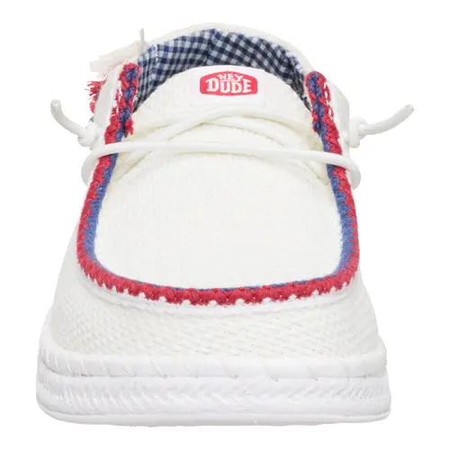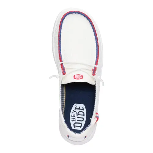 Let freedom ring with the Wendy Espadrille Americana – a cool, festive look that takes on ultra HEYDUDE™ comfort. Designed with a breathable, textile upper, a waffle textured heel with colorful tassels and elastic laces to slip on and off with ease. Finished off with a lightweight, espadrille inspired outsole and plenty of warm weather vibes.