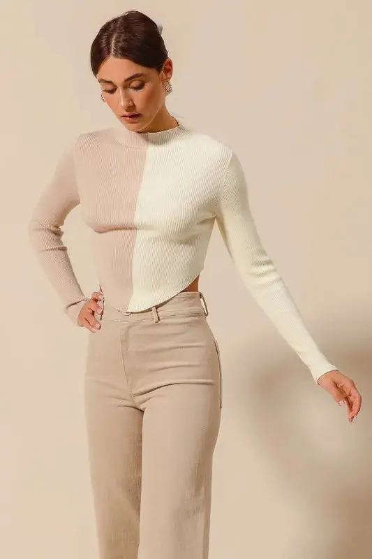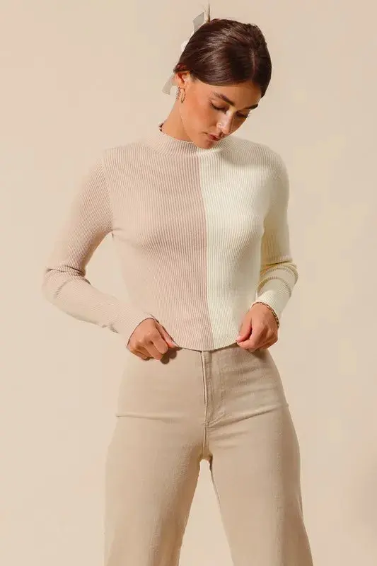 This color block knit top combines comfort and style with its soft, stretchy fabric and ribbed texture. Featuring a flattering fit, long sleeves, and a high neckline, it’s perfect for casual or dressy looks. The neutral beige and cream colors make it easy to mix and match with your wardrobe.