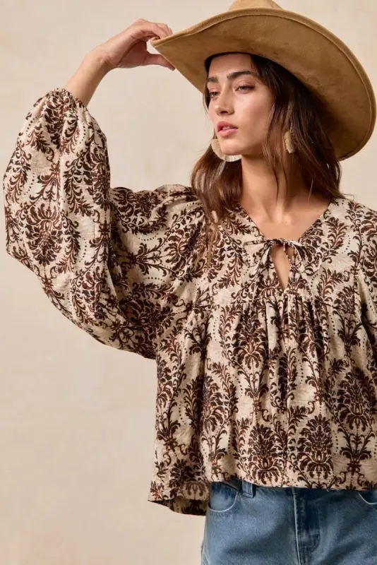 Elevate your wardrobe with this charming front-tied blouse featuring eye-catching printed details and romantic balloon sleeves. The tie-front design flatters your figure while the voluminous sleeves add contemporary flair. Perfect for pairing with high-waisted bottoms, this versatile piece transitions effortlessly from casual days to dressed-up evenings.