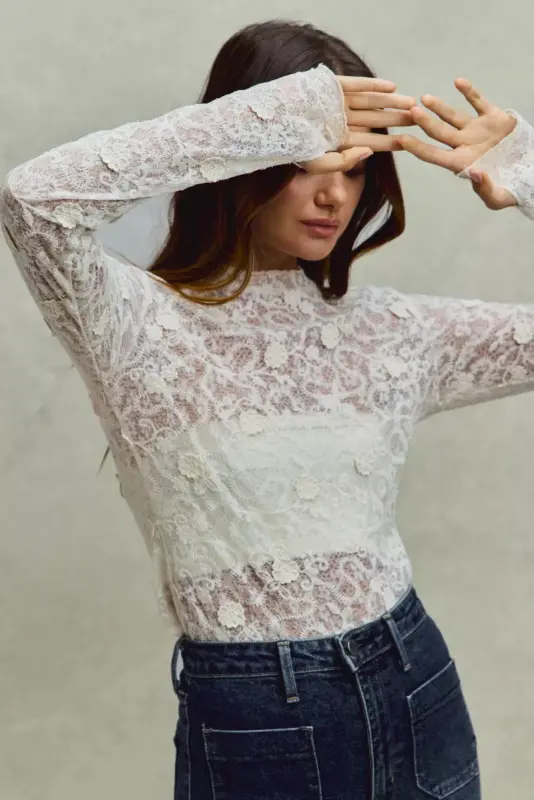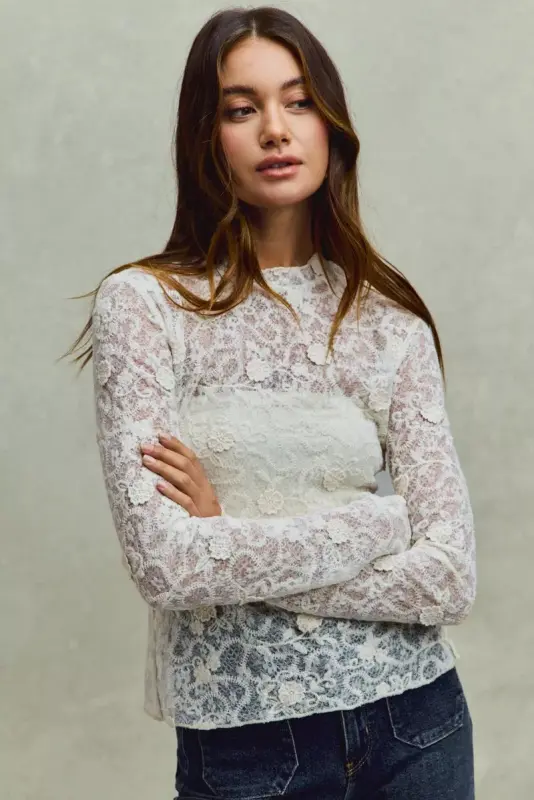 Romantic and versatile, this long sleeve layering top features delicate lace with a striking 3D floral design. Layer it over your favorite pieces for an effortlessly elegant look that works for any occasion.