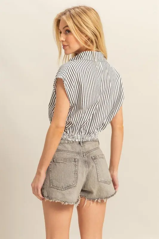 Elevate your casual style with this Striped Cap Sleeve Blouse. This blouse features a unique Johnny collar and elastic hem, adding sophistication to the classic striped design. Perfect for all-day wear, pair with jeans or trousers for a polished yet relaxed look.